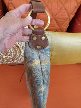 Multi-color paisley-printed leather bag.
