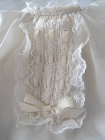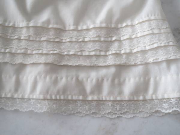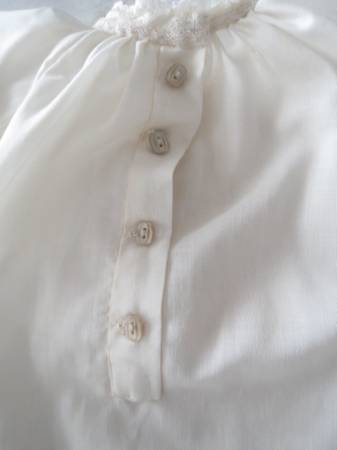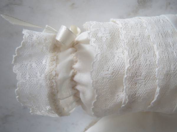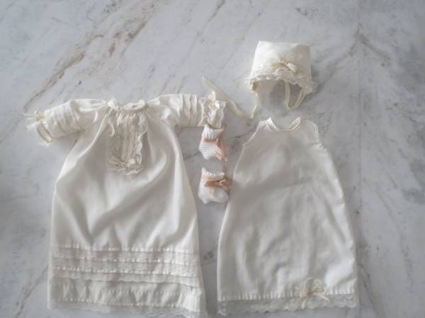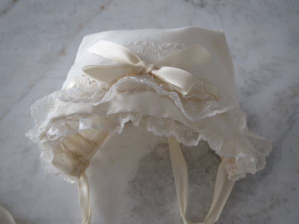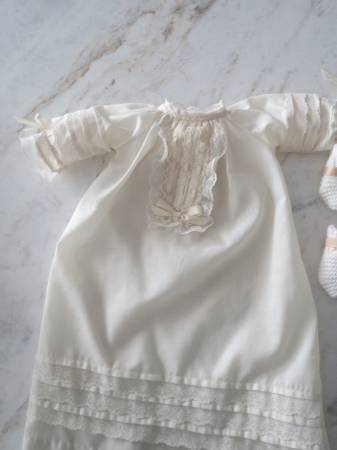 This beautiful outfit was hand sewn by my friend, Ethel. Included in the set is the dress, the slip, a bonnet and knit booties. The outfit would fit a small baby or a doll. It's made of cotton with lots of lace embellishments and light beige in color. So pretty. Just $25 cash, please. Thanks!