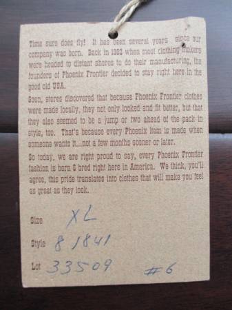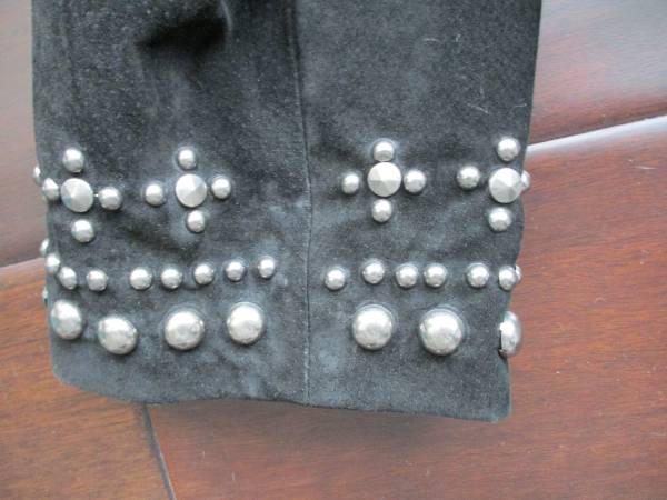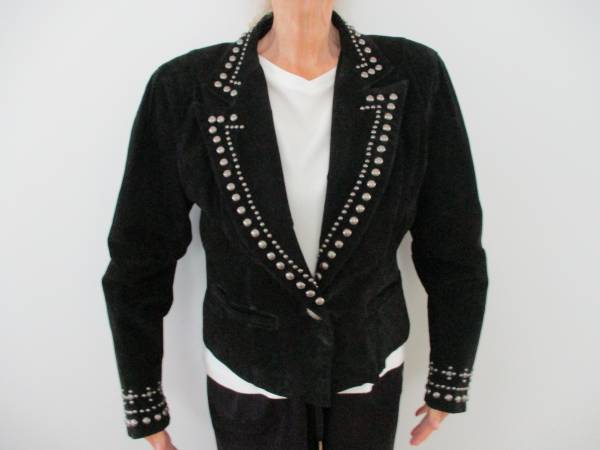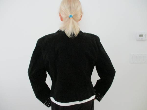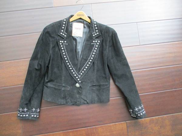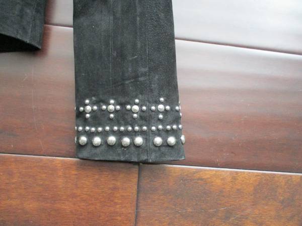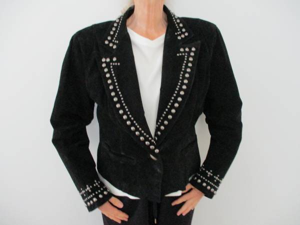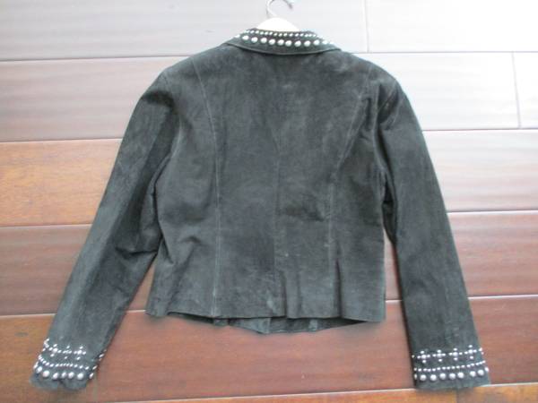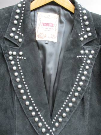 For sale is this beautiful suede jacket I bought from Robert Redford's Sundance store that I never got around to wearing. The jacket is made of black suede highlighted with silver studs and one center button. There's two small pockets in the front. The jacket hangs just below the waist; the size is XL. It's made in America by the Frontier Collection. New with tags, just $99, cash only, please.