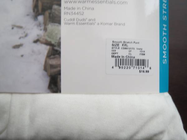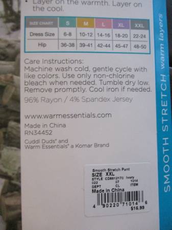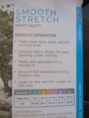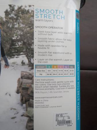 For sale is one package of new Cuddlduds leggings, still in original packaging. The size is XXL. They add a lot of warmth without the bulk. The only reason I am selling these is I lost a lot of weight and they are too big for me. Just $6, cash only, please. Thanks for looking.