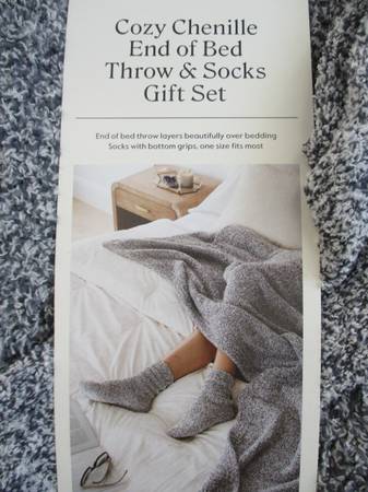 For sale is this beautiful Threshold Chenille End of Bed Throw and Socks gift set. A friend his this set and just loves it. Both the throw and the socks are made of chenille. The throw measures 60 x 80 inches, the crew socks fit most sizes. Both pieces are machine wash and dry. New in package, just $19, cash only, please. Thanks.
