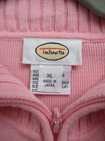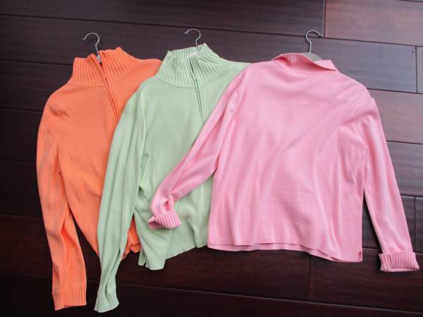 Lost weight and can no longer wear these beautiful sweaters. For sale are three Talbot's long sleeved sweaters in beautiful pastel colors. The sweaters are made of 100% cotton and feature a zip neck that can be worn partially unzipped as a collar or fully zipped for a more mock turtle look. Size is XL, just $15 each, cash only, please. Thanks!