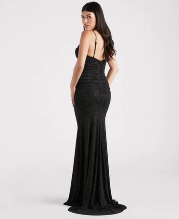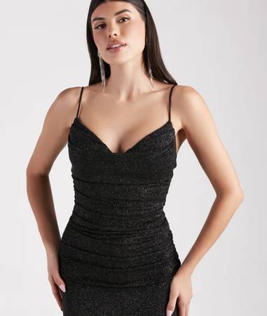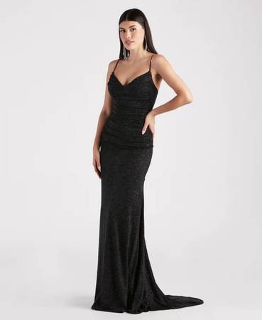Embellished with light-catching glitter, the Tamora formal dress is destined to glow at school dances and awards banquets! She features a stunning sleeveless sweetheart plunge cowl neckline, a padded bust, adjustable spaghetti straps, and side ruching to accentuate your figure along her mermaid silhouette with a floor-length hem. The formal dress is composed of glitter knit fabric with a knit lining and plenty of stretch. Complete the look with dainty rhinestone earrings and a clutch.