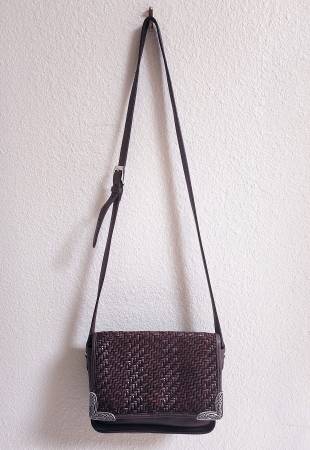 - Brown woven leather front flap with silver plated hardware corners and magnetic closure