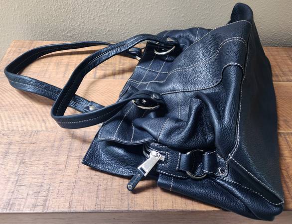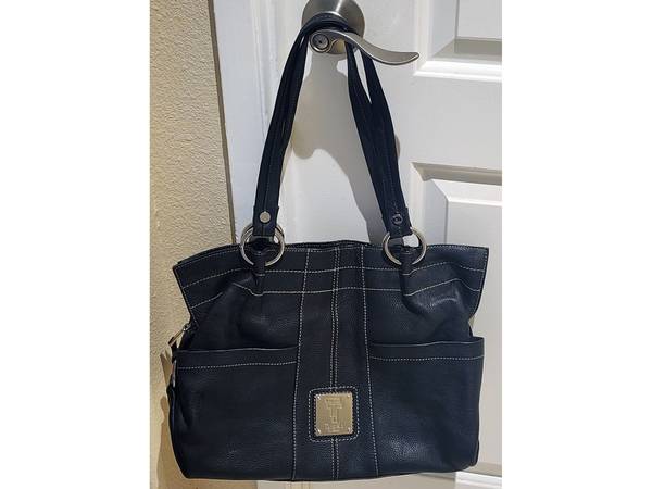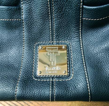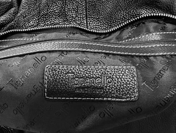 This Tignanello (New York-based Italian brand) classic satchel bag is made of DURABLE, high-quality THICK, soft black pebbled LEATHER accented with authentic large silver logo hardware square on front. This authentic Tignanello purse (not a KNOCK-OFF) has even and seamless stitching throughout, leather stamped “Tignanello Since 1989” logo tag inside on logo lined black interior. It features a zippered top with zip and slip compartments for easy organization and 2 exterior pockets for a cell phone. Excellent condition - with no rips, no tears, no discoloration, looks great! Smoke free, pet free home. IF THIS AD is UP, it is still AVAILABLE.