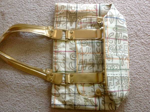 Coach bag with gold trim. Measures 17" wide x 12.5 tall. Zippered closure
