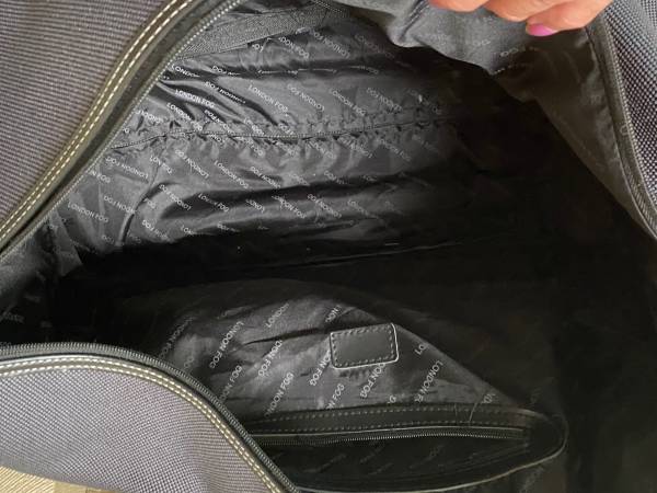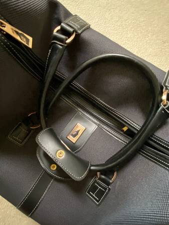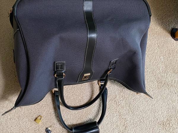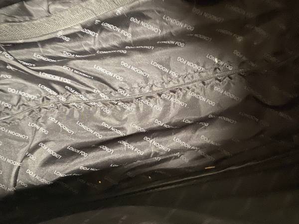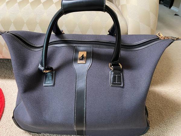 Large rolling travel bag by London Fog. With lock and keys. Used briefly. Dark grey. Measures 20” x 10”. Very good condition