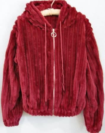 This is a wonderful Soft fluffy Chenile women or teen hooded jacket with front zipper. It has front pockets and elastic bottom and cuffs of the sleeves. It is cozy outside and inside and hood can be worn on the head or you can pull it's draw string and it can hug your neck. It says size L but can be worn by different sizes.