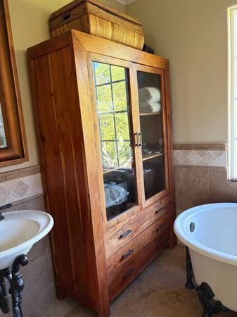 Modern rustic china cabinet, currently being used as a bathroom cabinet. Solid wood and glass doors. 48”w x 76” t x 18.5 “ deep