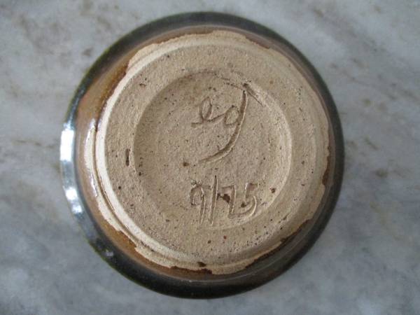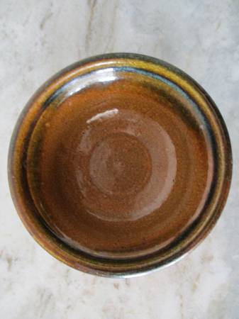 I bought this beautiful bowl in 1975 from the artist who lived in Iowa. The bowl is hand made and measures 4 inches in diameter and stands 1 1/2 inches tall. The bowl has a clear glaze over variations of tan and brown. There's a slight lip at the rim of the bowl. The bowl is initialed by the artist and dated: "edg 9/75". In very nice condition, I use a similar bowl for my earrings, paper clips and other small items. Looks nice and serves a function. Just $9 cash, please. Thanks for looking.
