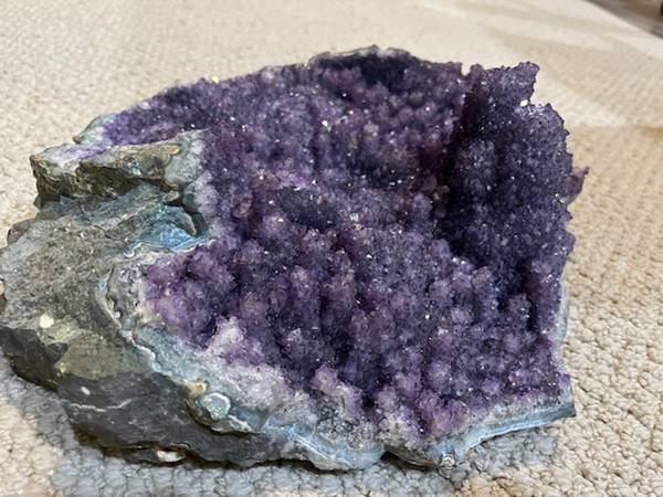 Stunning piece of purple amethyst grape agate, 17 lbs, about 9" x 12". Tallest portion is 4". 2 1/2" tall at its thickest side. The specimen features tiny spherical quartz crystals resembling tiny...