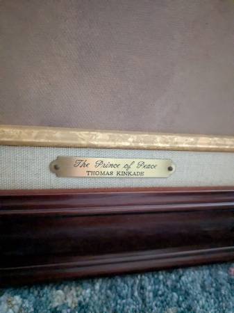 I am offering a stunning Thomas Kinkade painting titled "Prince of Peace" on a 14x18 inch canvas (artwork larger with cherry wood frame), using oil painting technique. It is #111 out of a limited edition. The attention to detail is remarkable! The beautiful colors are so vibrant! It has been stored so the condition of this lovely piece is excellent. Comes from a pet/smoke-free home. I am downsizing my collection since we will be moving soon to another state. Would make an unforgettable Holiday gift or for any special occasion. This signed lithograph artwork numbered from the artist features an Americana style with a religious theme, depicting Jesus as the Prince of Peace. The painting was produced in 1999 in California, USA and comes with a Certificate of Authenticity issued by The Thomas Kinkade Company as shown in the picture originally attached to the back of the artwork. It is a licensed reproduction and is framed in a gorgeous ornate cherry wood frame that is rare to come by for display, making it a beautiful and meaningful addition to any art collection. Thank you for looking at our post! Happy Holidays!