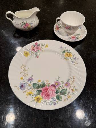 Royal Doulton China set like new, with dinner plates total 6 with 5 cups and saucers, creamer and sugar bowl all for $125. See photos in excellent condition.