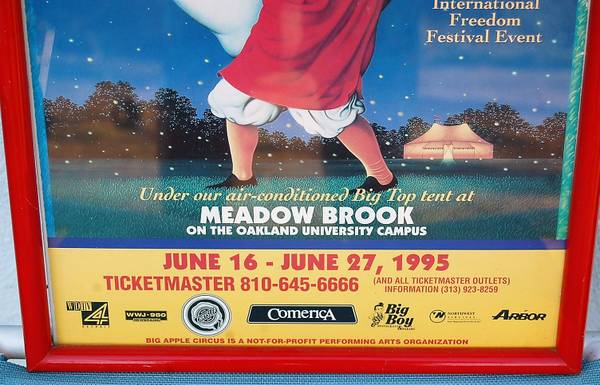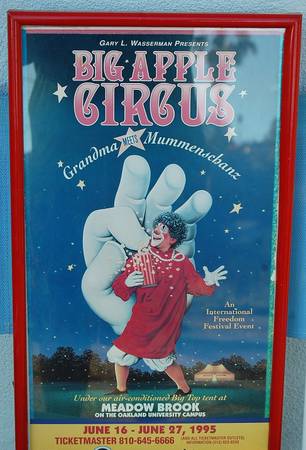 This listing is for a wonderful 1995 Big Apple Circus Poster - Grandma Meets Mummenschanz - Professionally Framed and ready to hang. The poster itself measures approximately 13"w x 24"h, so framed it is a little larger. Payment in cash only, and the asking price is firm. Please call David (no texts, please) for more information or to set up a time to see this item in Escondido. My items are for local pick-up only, no shipping, and please no offers to trade. Thanks!