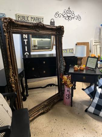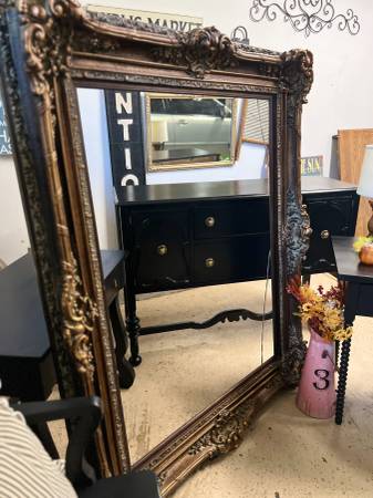 Beautiful, large baroque frame. This stunning frame appears to be carved from wood and is heavily gilded, making a visual statement with elaborate scrollwork, curves and motifs. Luxurious in...