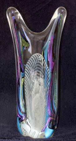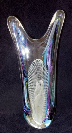 Amazing - Rollin Karg Abstract Art Glass Sculpture, one of a kind. This is an exceptionally large piece at 18" in height and weighing 16lbs. Dichroic multi-color metallic blue lavender and purple crystal-clear thick and heavy glass. This 1999 art glass is flawless and shows no wear whatsoever.