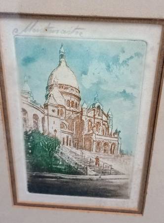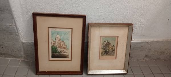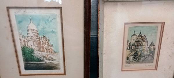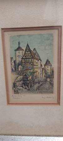 $35 each hand colored etchings one is the Basilica in France and the other is the German Rothenberg de Taub both signed cannot make out the signatures both titled framed early 20th century 1920s or 1930s. 11x8-in framed and matted