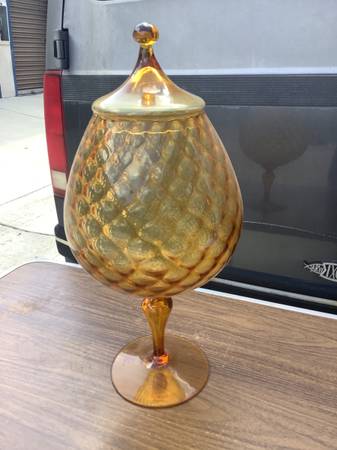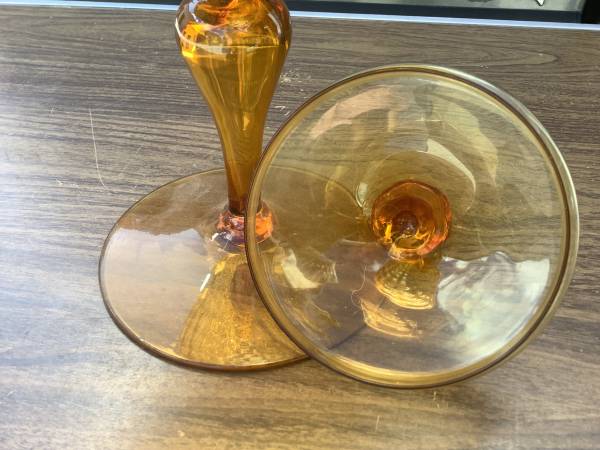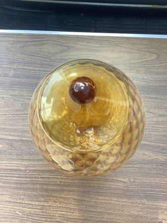 Selling a beautiful Vintage Amber Glass container with Diamond design. Measures 18” tall X 8” wide. In amazing condition without cups or cracks (2 piece). Please text for communication.