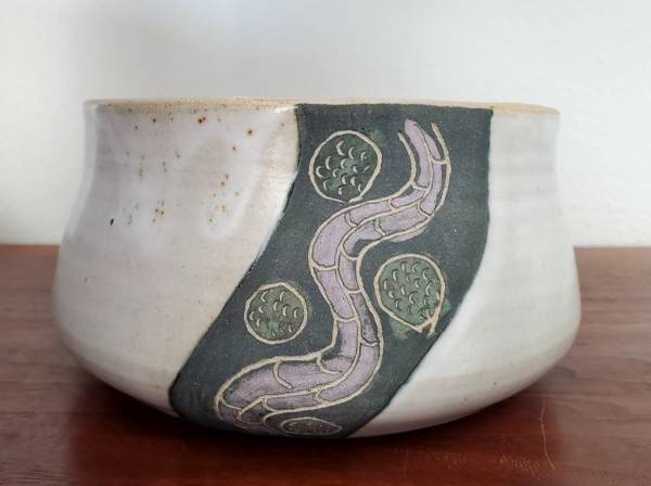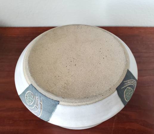 Vintage mid century stoneware lidded bowl. Great abstract hand painted modernist designs. Immaculate condition with no cracks or chips, or crazing. Artist's chop mark is on the bottom.