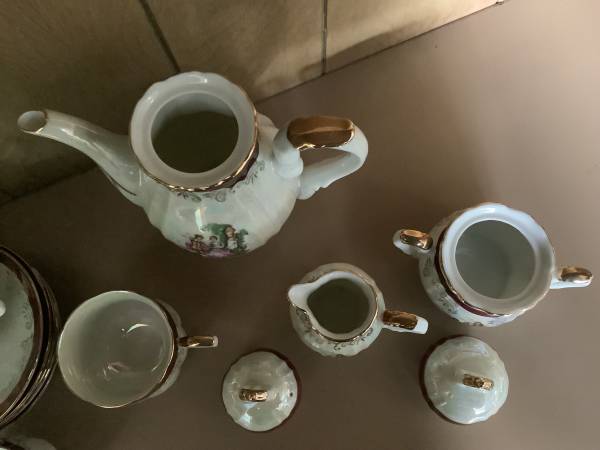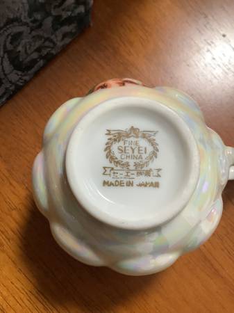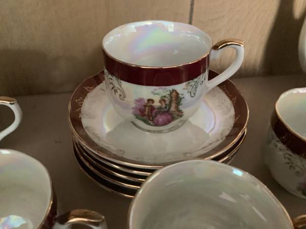 Selling a vintage Seyei Fine China Lusterware Tea Set, made in Japan. In amazing beautiful condition. Total of 15 pieces: Teapot w/cover, sugar bowl w/cover, creamer, 5 each of cups and saucers. Teapot stands 7 1/2” tall and trimmings are gold. Excellent condition…….Price is Firm! Please text listed number.