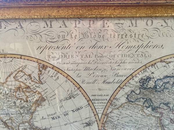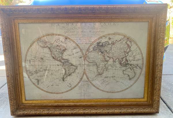 This is a beautifully framed reproduction of an antique world map LA MAPPE ~ MONDE.
