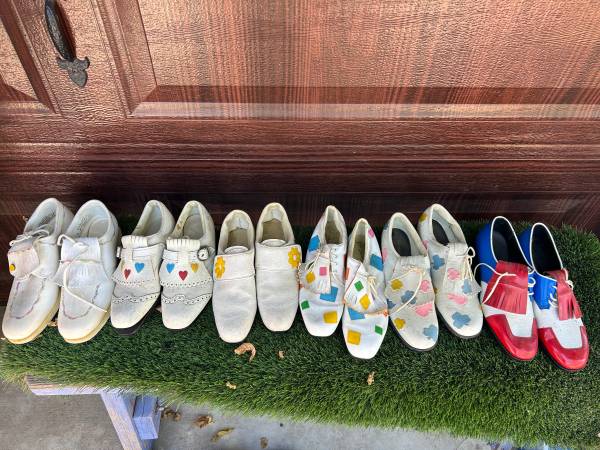 Ladies golf shoes vintage sizes 6.5 and 7 starting at $10 ea and up. There are a few leather/nicer and last photo flowers that are $20. Conditions vary. Most will need some TLC and new spikes. There...