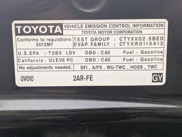 * 8-Way Pwr Driver Seat * Rear Spoiler * 50 State Ulev2 Emissions * Black; Fabric Seat TrimThis vehicle includes a Money-Back Guarantee* and passed our precise inspection process. Best of all the price you see is the price you pay. No haggling. No back and forth. No pressure. And this price is so good it is guaranteed.Contact BMW of Carlsbad today for information on dozens of vehicles like this 2012 Toyota Camry SE. The greater your fuel-efficiency, the less your carbon footprint. And with exceptional MPGs, this Toyota Camry treads ever so lightly on Mother Earth. One of the best things about this Toyota Camry is that it has low, low mileage. It's ready for you to truly break it in. Look no further, you have found exactly what you've been looking for. More information about the 2012 Toyota Camry: The Toyota Camry has been America's top selling passenger car for the past nine years, and for good reason, as it's known for providing its owners with comfort, economy and long service. But in 2012, the sensible Camry gets some styling updates to make it even more appealing to buyers and the Hybrid model gains a significant amount of horsepower as well. It's well-suited against midsize segment rivals thanks to a reputation for quality and value per dollar. Strengths of this model include ride quality and V6 and hybrid versions available, impressive interior space*Money-Back Guarantee is valid for 5 days or 250 miles, whichever comes first. Subject to certain terms and conditions. See store for details. Some restrictions apply.