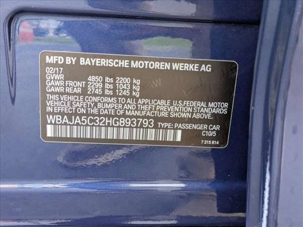 * Canberra Beige/Black; Dakota Leather Upholstery * Mediterranean Blue Metallic * Sun/Moonroof * Leather Seats * Navigation System * Keyless StartThis vehicle includes a Money-Back Guarantee* and passed our precise inspection process. Best of all the price you see is the price you pay. No haggling. No back and forth. No pressure. And this price is so good it is guaranteed.Thank you for visiting another one of BMW of Carlsbad's online listings! Please continue for more information on this 2017 BMW 5 Series 530i with 87,346mi. This BMW includes: PREMIUM PACKAGE WHEELS: 19" M SPORT PACKAGE *Note - For third party subscriptions or services, please contact the dealer for more information.* Outstanding craftsmanship and artisanal refinements abound with this BMW 5 Series 530i. If you are looking for a vehicle with great styling, options and incredible fuel economy, look no further than this quality automobile. It's not often you find just the vehicle you are looking for AND with low mileage. This is your chance to take home a pre-owned and barely driven BMW 5 Series. This vehicle comes with a navigation system. That doesn't mean you won't get lost. But it does mean you won't stay lost. More information about the 2017 BMW 5 Series: The BMW 5-Series is a mid-sized luxury sedan, competing with the Mercedes E-Class, the Audi A6 and the Lexus GS series. Costing upwards of $50,000, the 5-Series offers all the luxury of its various competitors, while giving drivers a significantly sportier driving experience than any of its peers. Handling is and always has been world-class for the line, with powerful engines, sharp steering and a playful chassis. The 5-Series is even offered in hatchback-styled Gran Turismo models that offer extra cargo flexibility. Strengths of this model include Bold styling, powerful engine options, luxurious and tech laden interior, sporty handling*Money-Back Guarantee is valid for 5 days or 250 miles, whichever comes first. Subject to certain terms and conditions. See store for details. Some restrictions apply.