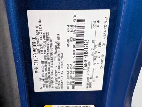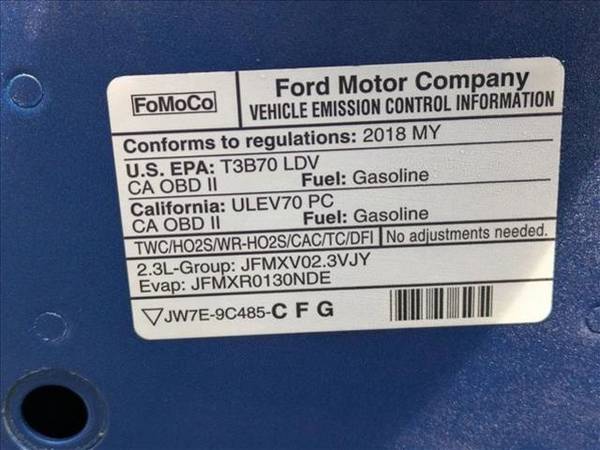 * Wheel & Stripe Package * Keyless Start * Ebony Tape Stripe * Ebony; Cloth Bucket Seats * Engine: 2.3L Ecoboost * Equipment Group 100A * Front License Plate Bracket * Lightning Blue Metallic * Spoiler Delete * Transmission: 6-Speed ManualLooking for a clean, well-cared for 2018 Ford Mustang? This is it. This Ford includes: ENGINE: 2.3L ECOBOOST (STD) 4 Cylinder Engine Gasoline Fuel Turbocharged *Note - For third party subscriptions or services, please contact the dealer for more information.* This is about the time when you're saying it is too good to be true, and let us be the one's to tell you, it is absolutely true. Surprising quality accompanied by a high level of performance...this Lightning Blue Metallic on Dark Ceramic Ford Mustang EcoBoost could end up being the perfect match for you. Driven by many, but adored by more, the Ford Mustang EcoBoost is a perfect addition to any home.