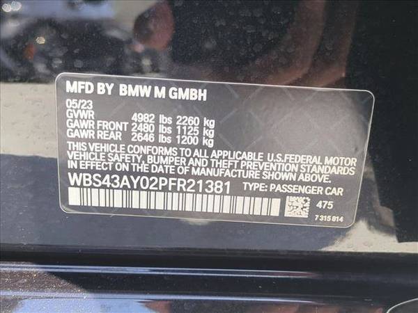 * Executive Package * Carbon Fiber Trim * Parking Assistance Package * Black Sapphire Metallic * Leather Seats * Navigation System * Keyless Start * Rear Spoiler * Heads-Up Display * Black; Extended Merino Leather Upholstery * M Sport Seats * Wheels: 19"X9.5" Fr. & 20"X10.5" Rr M BlackThis vehicle includes a Money-Back Guarantee* and passed our precise inspection process. Best of all the price you see is the price you pay. No haggling. No back and forth. No pressure. And this price is so good it is guaranteed.2023BMWM3 This BMW includes: EXECUTIVE PACKAGE Remote Engine Start Heated Steering Wheel Heads-Up Display PARKING ASSISTANCE PACKAGE Automatic Parking Back-Up Camera Aerial View Display System *Note - For third party subscriptions or services, please contact the dealer for more information.* This is a Certified Pre-owned vehicle, so you can feel rest assured that it has been meticulously inspected from top to bottom. Is it possible to fall in love with a vehicle? It is when your vehicle is as prestige as the BMW M3. You'll love the feel of AWD in this 2023 BMW M3. It provides a perfect balance of handling power and control in virtually every driving condition. It's not often you find just the vehicle you are looking for AND with low mileage. This is your chance to take home a pre-owned and barely driven BMW M3. Added comfort with contemporary style is the leather interior to heighten the quality and craftsmanship for the BMW M3 Competition xDrive. If, upon choosing the road less traveled you find yourself lost, relax and remember this beautiful car has navigation.*Money-Back Guarantee is valid for 5 days or 250 miles, whichever comes first. Subject to certain terms and conditions. See store for details. Some restrictions apply.