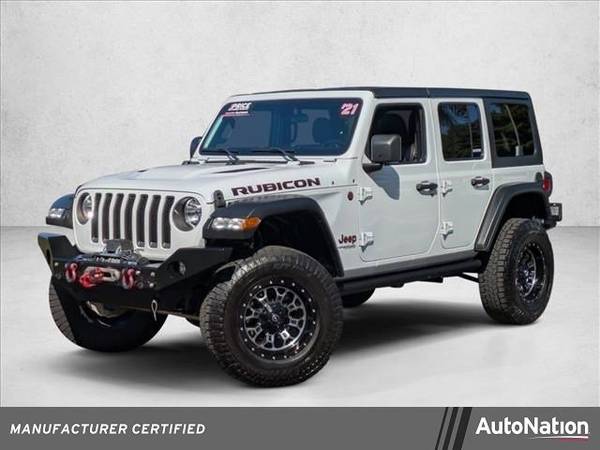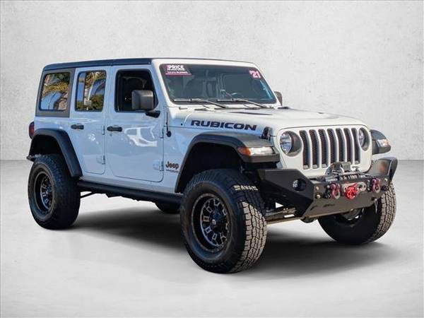 * Black 3-Piece Hard Top * Remote Proximity Keyless Entry * Keyless Start * Convertible Hardtop * 4.10 Rear Axle Ratio * Black; Premium Cloth Low-Back Bucket Seats * Bright White Clearcoat * Engine: 3.6L V6 24V Vvt Upg I W/Ess * Front License Plate Bracket * Gvwr: 5;800 Lbs * Performance Suspension * Tires: Lt285/70R17C Bsw Off-Road * Transmission: 6-Speed Manual * Wheels: 17" X 7.5" Machined W/Black PocketsCheck out this pre-owned 2021 Jeep Wrangler we recently got in. This Jeep includes: ENGINE: 3.6L V6 24V VVT UPG V6 Cylinder Engine Gasoline Fuel *Note - For third party subscriptions or services, please contact the dealer for more information.* This versatile SUV is perfect for families or contractors with its oversized cargo area, exceptional horsepower and option upgrades. This Jeep Wrangler Unlimited Rubicon's level of quality is not meant for just anyone. It's meant for the person who strives for a classy, comfortable, and luxurious car. No matter the terrain or weather, you'll drive at ease in this 4WD-equipped vehicle. With exceptional safety features and superb handling, this 4WD was engineered with excellence in mind. It's not often you find just the vehicle you are looking for AND with low mileage. This is your chance to take home a pre-owned and barely driven Jeep Wrangler.