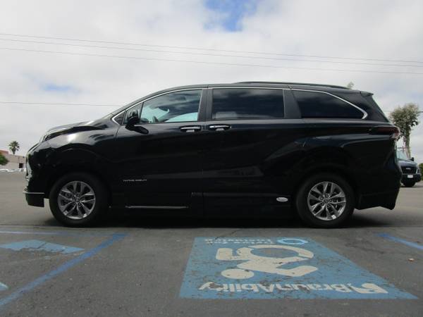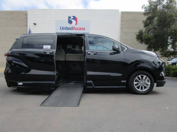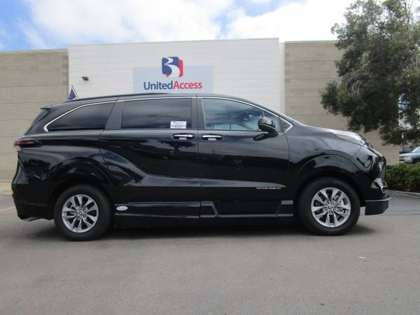 United Access of San Diego located in the Kearny Mesa district is selling a 2024 Toyota Sienna XLE Hybrid in Black with only 5,842 miles on the odometer. This Sienna has been converted into a wheelchair accessible vehicle to help people with mobility issues be able to get out and enjoy life like everyone else can. The conversion includes a custom lowered floor to make room for a wheelchair, computer controlled electronic power deploying and retracting ramp system that's integrated to the passenger side sliding door, an also computer controlled and integrated power kneeling system to lower the van, driver and front passenger seats which are easily removable and built on rolling platforms for moving, strong and simple to use integrated L track system in the floor for securing wheelchairs, as well as many other modifications to make transporting someone with mobility issues safer and much more convenient.