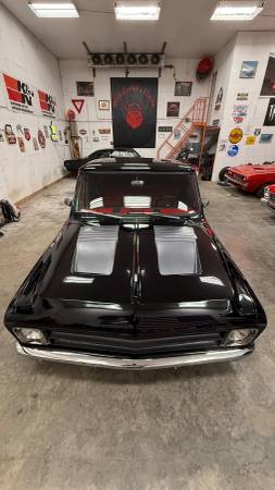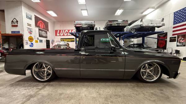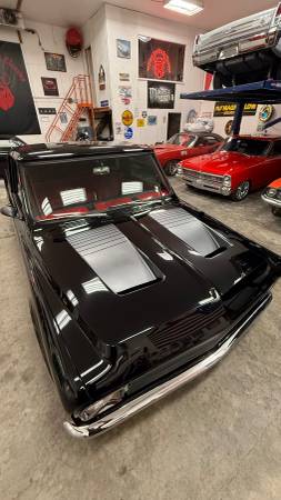 This highly customized one-off C10 was completed in 2017 as a 1971 C10 built with a custom 1968 front end.The reverse-tilt hood is operated via an electronic lift system and opens with the push of a button. It has seen some extensive drivetrain modifications, and now features a 330hp Mutha-Thumper-filled 350ci 8-cylinder engine backed by a 4-speed manual transmission, coilover rear suspension and 4-wheel power disc brakes. The body has also been heavily modified, as the cab has been stretched 6 inches, the B-pillars have been moved 2 inches forward and the cab has been fused to the bed for a completely unique look. The body is channeled over an '83 Chevy S10 frame and sports a ducted hood and fused tailgate, which both give it a unique look. The extensive bodywork is covered in PPG black over silver with several coats of clear. The interior has been finished in red paint and bright red Corvette vinyl upholstery. The instrument panel moved to the center.
