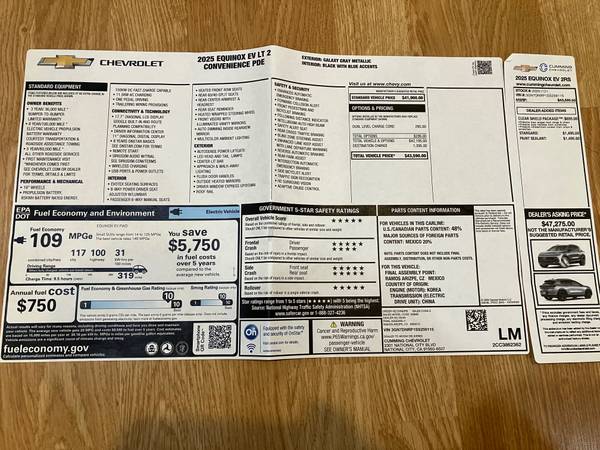 2025 Chevrolet Equinox EV 2LT. Only 3 months old and approximate 4000 miles. In flawless and as new condition. 120V/240V EV charge cord included. Dashcam and integrated cargo liner included. Door/infotainment screen scratch protection and paint sealant applied at dealership. Registered till September of 2026. MSRP $43590. My loss is your gain, priced for quick sale $31000 firm.