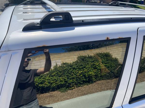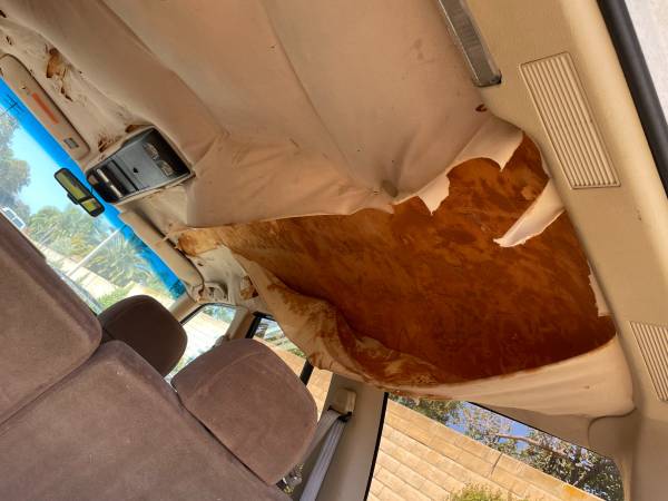 The foam under the head liner has begun to deteriorate, causing the fabric to droop and tear (see photos). There is also rust at the right rear panel around the window (see photos). Console computer has an electrical fault causing it not to function the majority of the time. Right-rear automatic door lock does not work. Antenna does not retract.
