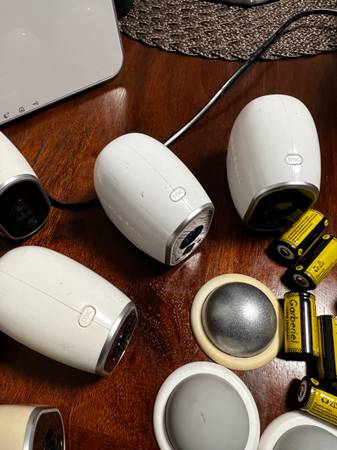 Wireless camera system, comes from our home, we got a different package and we don’t have any more use for this set, can can be mounted at anyplace, cameras are battery operated and you can access from any place in the world to your camera system using wifi or your phone service, take all at the photos, rechargeable batteries, charger, base station 5 cameras and 3 mounts.