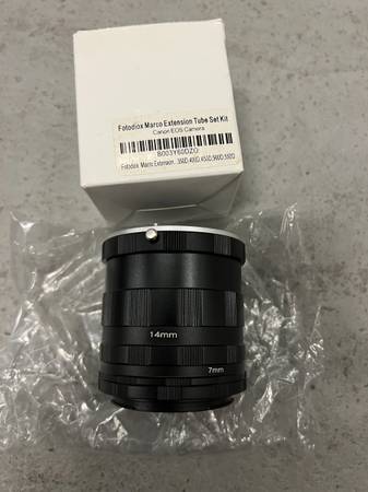 Brand new Fotodiox Macro Extension Tube Set Kit, compatible with Canon EOS DSLR cameras. Never used, in original box. This set includes three lightweight metal tubes (7mm, 14mm, and 28mm) that can be used individually or combined for varying levels of magnification. Perfect for close-up and macro photography, allowing your standard lens to focus much closer to the subject for detailed shots of small objects like flowers, coins, or insects.