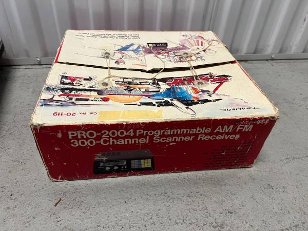 This unit is in good condition and fully functional, showing only minor cosmetic wear. It powers on, scans, and receives clearly. Includes the original box (shows wear from storage) and power cord.
