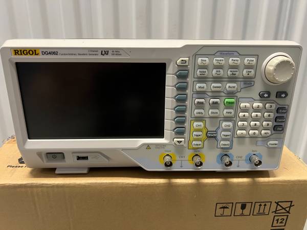 Rigol DG4062 dual-channel arbitrary waveform generator in like-new condition. Clean unit with no wear, stored in original packaging. Includes all factory accessories: probes/cables, power cord, manuals, and protective foam inserts.