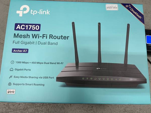TP-Link Archer A7 AC1750 Mesh Wi-Fi Router in excellent condition. Fully functional and clean, comes with original box. Dual-band performance (1300 Mbps + 450 Mbps) for strong, fast coverage throughout your home.