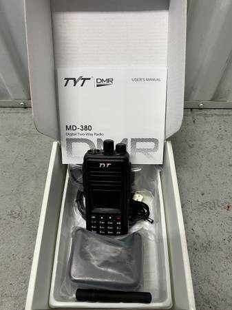 TYT MD-380 handheld DMR radio in like-new condition. Clean unit, barely used, stored in original packaging. Includes radio, antenna, battery, belt clip, charging accessories, USB programming cable,...