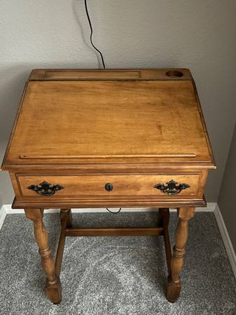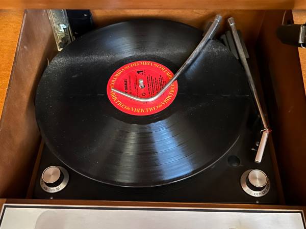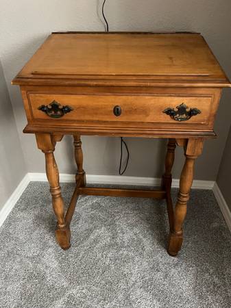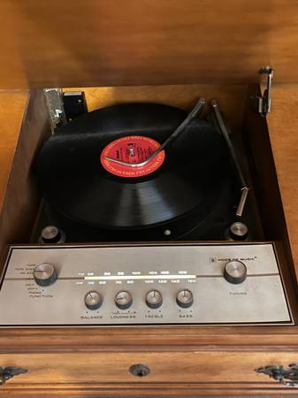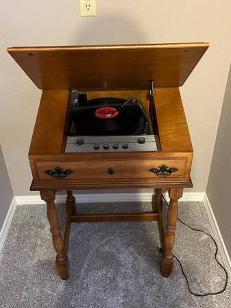 Voice of Music writer’s desk record player and am/fm radio. In good condition. Sounds good. Desk opens to expose the turntable and radio. Probably from the 50’s or 60’s.