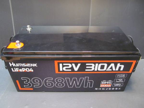 12V 310Ah LiFePO4 Lithium battery Capacity: 310Ah or almost 4 KWh Brand: Humsienk. Bluetooth monitoring by bluetooth app Condition: This battery was only used once for testing. It is otherwise in...