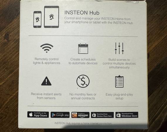 Brand new in box Insteon hub. Includes ethernet cable and power cord. Download the app to control and configure your home devices from your phone: lights, outlets, wall switches, etc. Reply to add...