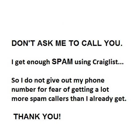Please do not contact me and ask me to call you, I get enough spam through the Craigslist sight..... so I do not give out my phone number, for fear of getting a lot more spam callers than I already get.