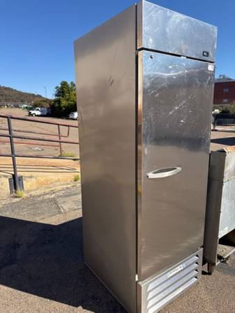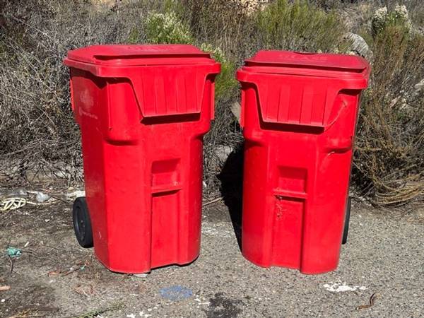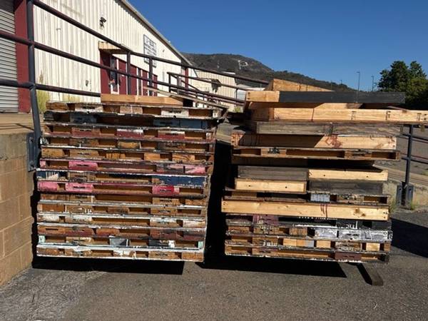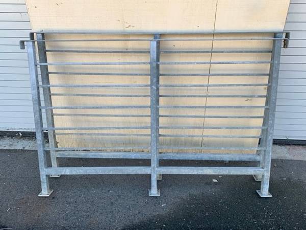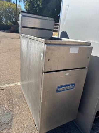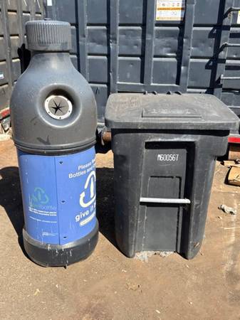 Also included are an industrial battery charger, commercial fryer, refrigerator, interlocking metal barriers, wood panels with cart, and outdoor trash cans.
