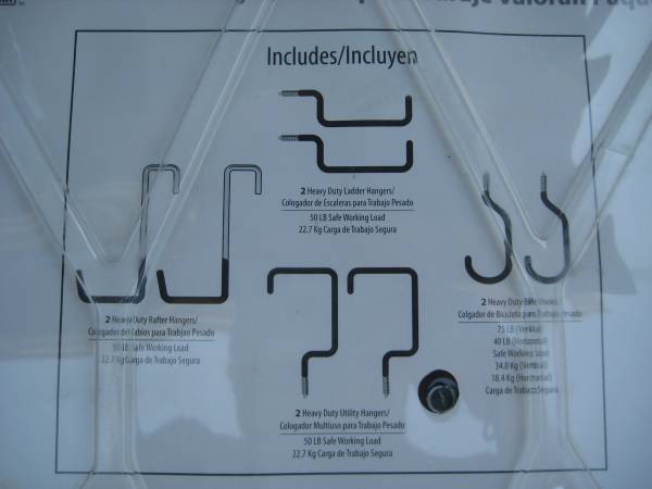 The package contains 2 ladder hooks, 2 utility hooks, 2 rafter hangers and 2 bike hooks.