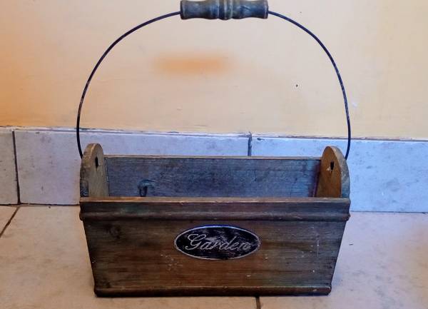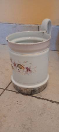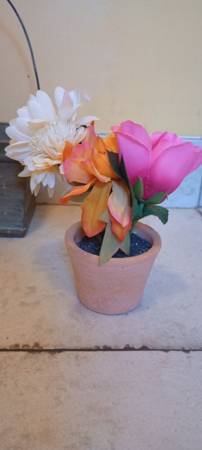 The very cute potted plant with faux flowers $2 small. The wood and metal garden basket $10 good condition measures inches. This is a treasure enameled metal citracup 1950s good condition very cute lovely artwork floral $20