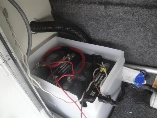 This battery box is customized to fit the inside compartment storage in a trailer, boat or RV with an interior storage compartment. It has a top vent and bottom vent.