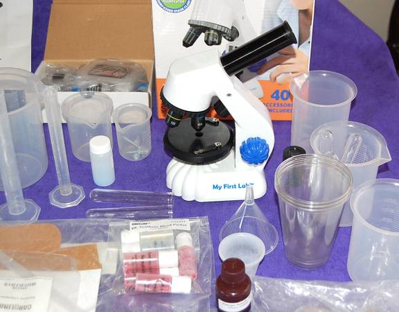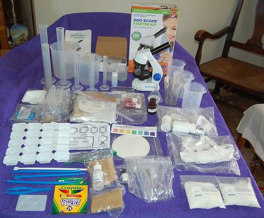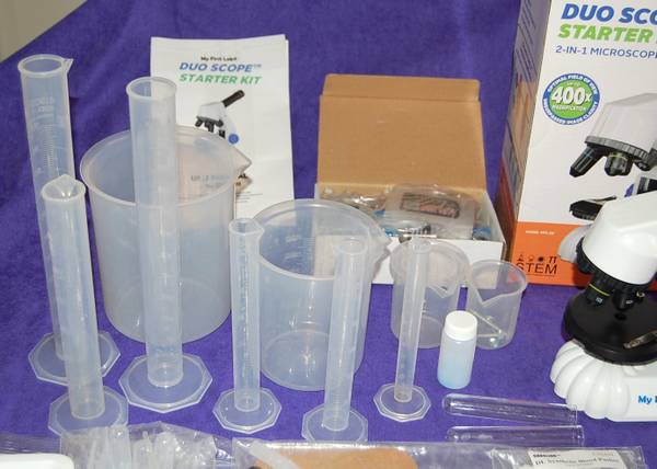 Priced to fit any budget, this 2-in-1 microscope with dozens and dozens of accessories is an excellent microscope for students. Two light sources allow for viewing both slides and solid objects, including coins, plants, stamps, insects, jewelry, and more. This scope features capabilities that would normally require the use of 2 instruments—a basic biological scope to look at specimens on a slide (light shines from underneath) and a traditional stereo or dissecting microscope to view solid objects at lower power (light shines down onto the specimen). The Duo-Scope easily handles either application. Cordless battery power makes it portable for field study. Accessories include 5 blank slides, 1 concavity (well) slide, and 4 prepared slides; 2 bottles of stain; forceps; plastic test tube; and petri dish. This Microscope kit currently sells for over $164.00 online, plus tax and shipping cost. This kit is pre-owned, but much of it looks to be unused. Please reply to this listing or call David for more information. Thanks! 2025-08-05-GRDSK